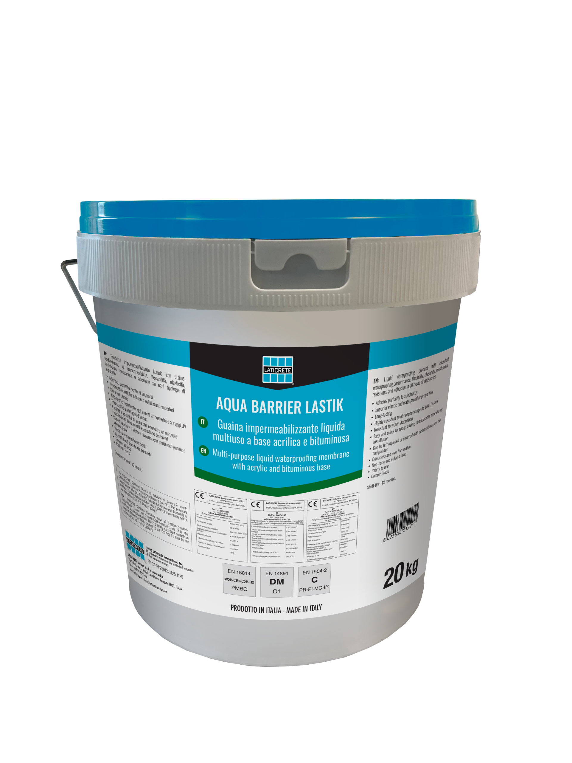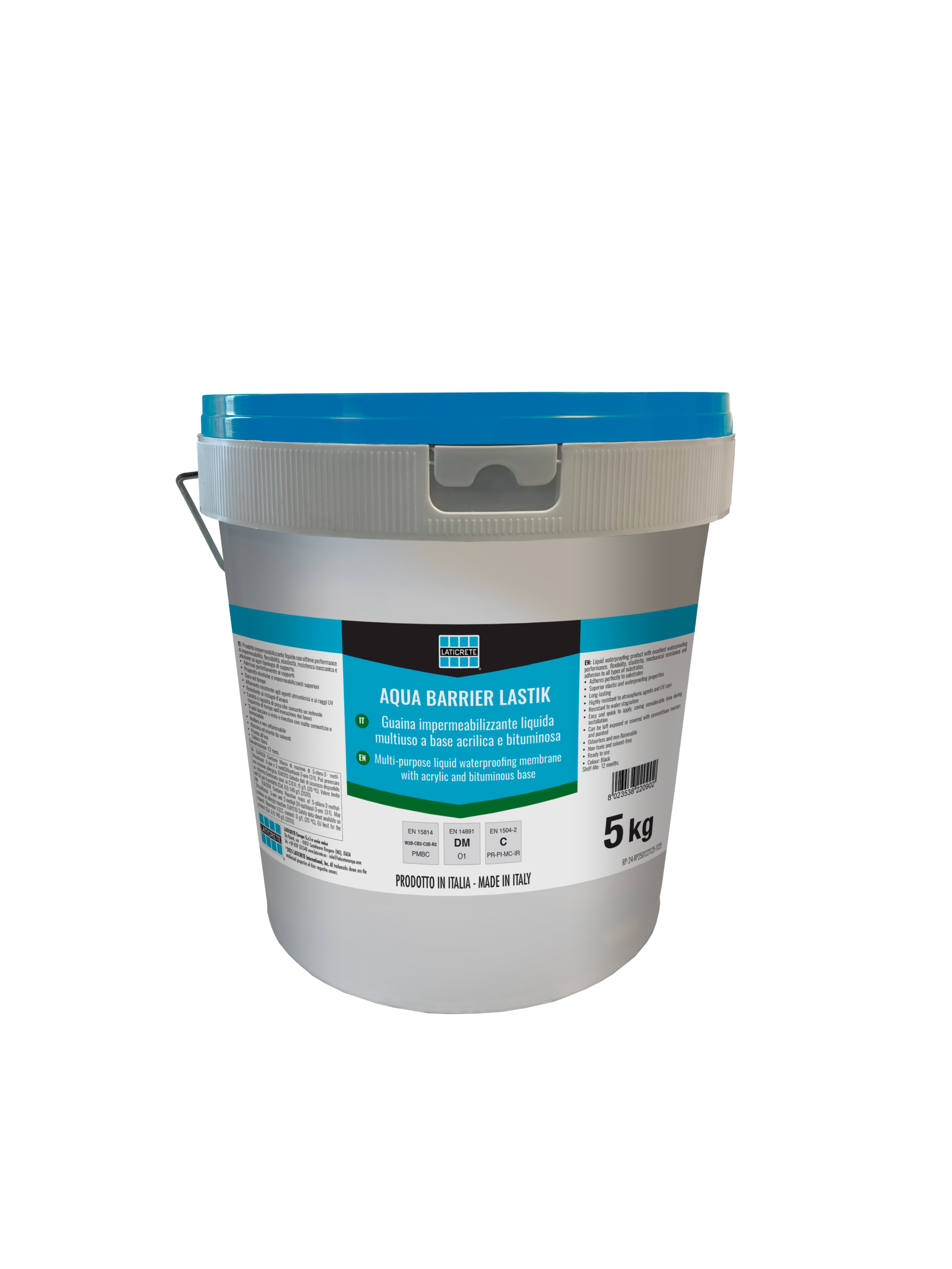 AQUA BARRIER LASTIK é uma membrana impermeabilizante líquida multiusos à base de acrílico e betume, com excelente desempenho em termos de impermeabilidade, flexibilidade, elasticidade, resistência mecânica e aderência em qualquer tipo de suporte.